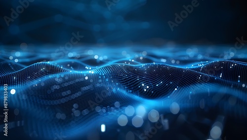 Abstract digital technology background with glowing connections and dots on dark blue, creating an immersive futuristic landscape. High-quality photo