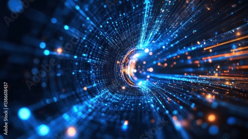 Abstract digital tunnel, vibrant particles, and glowing lines