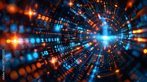 Abstract Digital Tunnel with Glowing Binary Code and Bokeh Lights