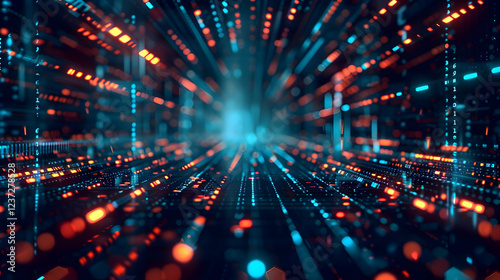 Abstract digital tunnel with glowing lights, representing data flow and technology.