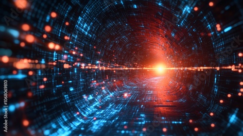 Abstract digital tunnel with glowing particles and a bright light at the end.