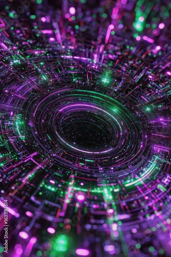Abstract Digital Tunnel with Glowing Purple and Green Lights, Circular Pattern, Futuristic Design