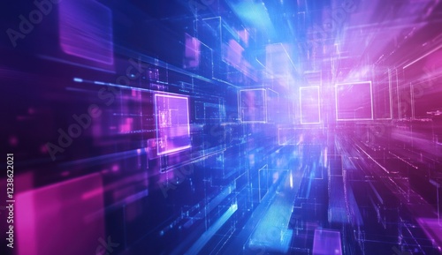 Abstract digital tunnel with glowing squares and lines.