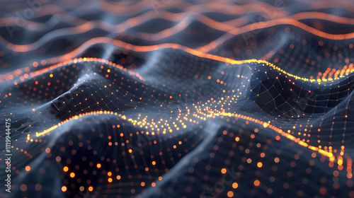 Abstract digital wave landscape with glowing particles and lines.