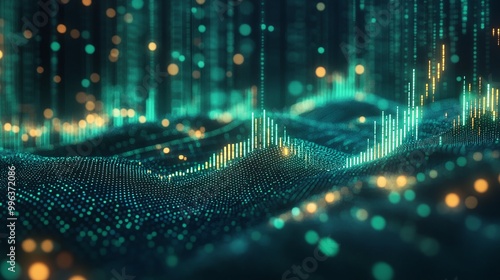 Abstract digital wave pattern with glowing lights and data visualization elements in a dark space.