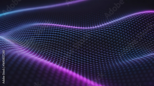Abstract digital wave pattern with glowing neon purple and blue light trails on a dark background