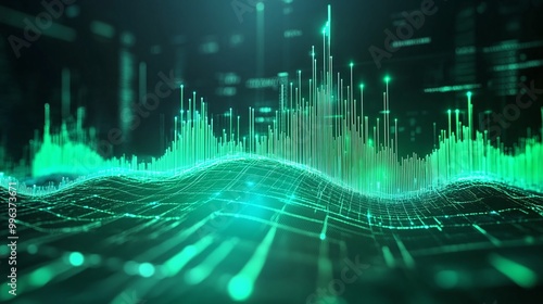 Abstract digital wave with glowing green lines and data visualization effect on a dark background.