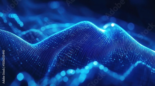 Abstract digital waves with glowing blue lines and particles representing technology and data.