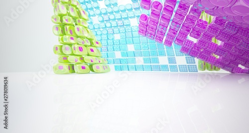 Abstract dynamic interior with colored smooth objects. 3D illustration and rendering
