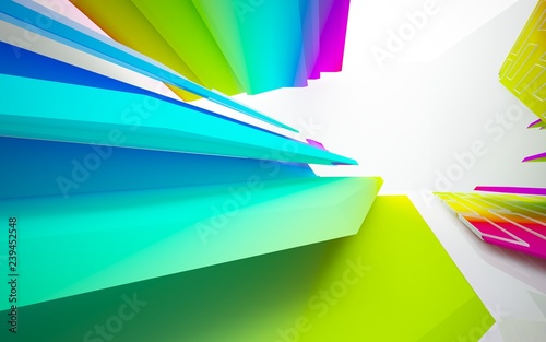 Abstract dynamic interior with gradient colored objects. 3D illustration and rendering