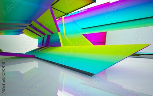 Abstract dynamic interior with gradient colored objects. 3D illustration and rendering