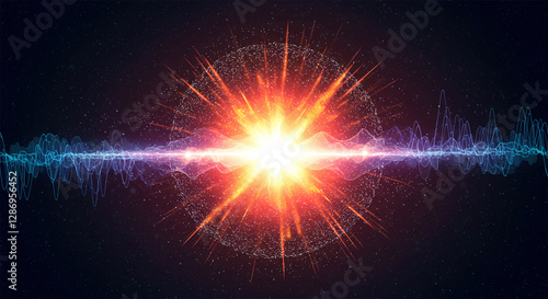 Abstract fiction vector illustration quantum computer technology. Sphere explosion background. Deep learning artificial intelligence. Big data visualization algorithms. Waves flow. Quantum explosion