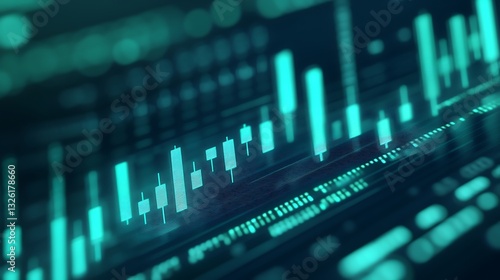 Abstract Financial Data Visualization with Green Bars and Candlestick Graphs on Dark Background