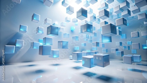 Abstract Floating Cubes in a Modern Space, Glowing with Soft Blue Light