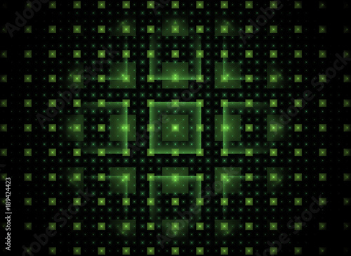 Abstract fractal tech background with green shiny squares on black