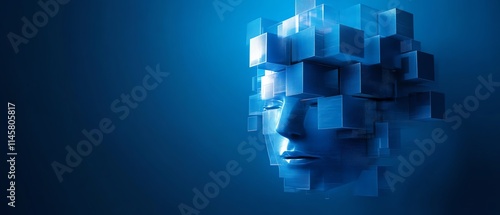 Abstract fragmented digital face made of floating cubes, representing AI and technological breakthroughs, with illuminated edges and a sleek, modern design