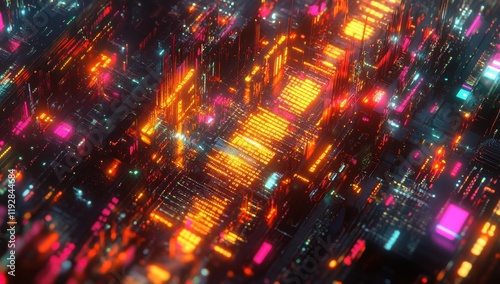Abstract Futuristic Cityscape with Glowing Neon Lights and Digital Architecture in Vibrant Colors to Represent Technology and Innovation Concepts