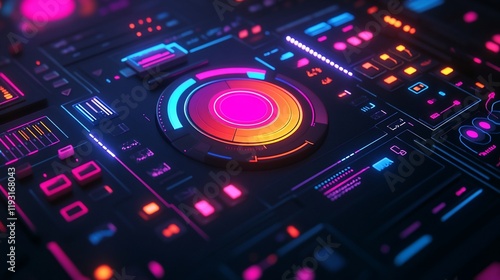 Abstract futuristic neon interface with glowing buttons and circular display.