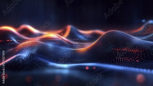 Abstract futuristic neon waveform with glowing particles and digital grid patterns