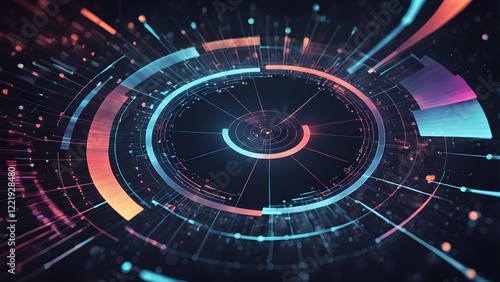 Abstract futuristic technology background with glowing circular lines and data streams in vibrant teal, orange, and pink hues.