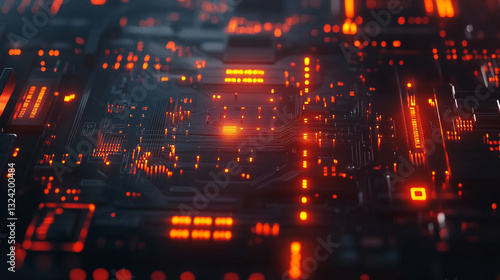 Abstract futuristic technology circuit board with glowing orange lines and details red dark data