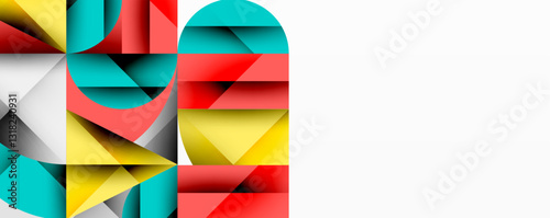 Abstract geometric artwork with overlapping circles and gradients, circle square triangle shapes background featuring sharp angular cuts, smooth shading, and structured layered composition