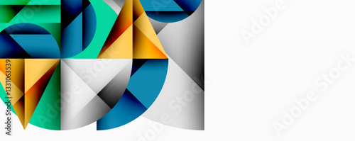 Abstract geometric artwork with overlapping circles and gradients, circle square triangle shapes background featuring sharp angular cuts, smooth shading, and structured layered composition