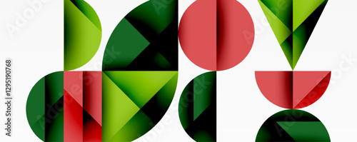 Abstract geometric background with layered gradient shapes forming dynamic patterns. Overlapping semi circles and triangles create depth and contrast