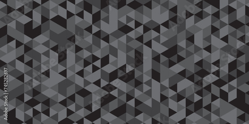 Abstract geometric black and gray background seamless mosaic and low polygon triangle texture wallpaper. Triangle shape retro wall grid pattern geometric ornament tile vector square element.