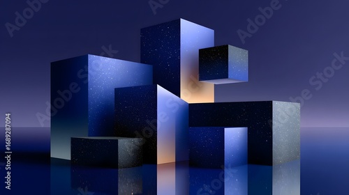 Abstract Geometric Composition of Colorful Cubes and Shapes in a Dark Blue Environment