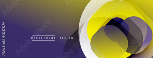 Abstract geometric composition. Overlapping circles create dynamic visual interest. Gradient background transitions from dark purple to golden yellow hues. Modern design element.