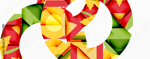 Abstract geometric composition. Shapes overlap, creating dynamic visual effect. Colors include red, yellow, green, white.