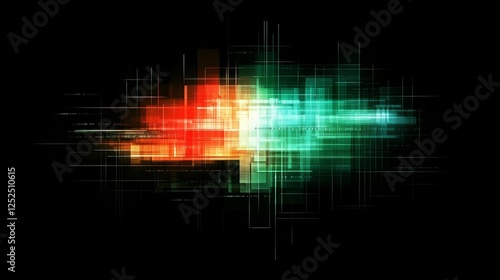 Abstract Geometric Composition with Luminous Blocks and Intersecting Lines on a Dark Backdrop.