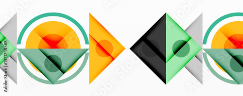 Abstract geometric composition with overlapping triangles, circles, and gradients, featuring a central circular design with text