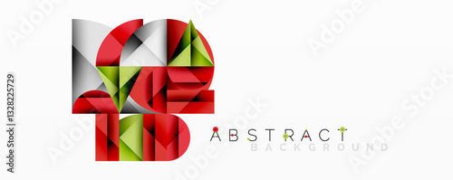 Abstract geometric design with intersecting circles, triangles, squares and sharp angles creating a layered composition with gradients, depth, and contrast