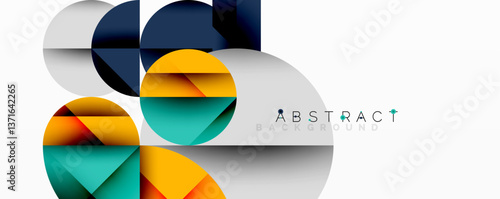 Abstract geometric design with intersecting circles, triangles, squares and sharp angles creating a layered composition with gradients, depth, and contrast