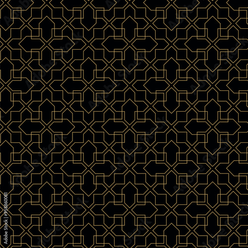 Abstract geometric pattern with crosses, stripes, lines. Seamless vector background. Black and gold ornament. Modern reticulated graphic design.