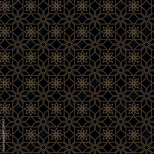 Abstract geometric pattern with crosses, stripes, lines. Seamless vector background. Black and gold ornament. Modern reticulated graphic design.