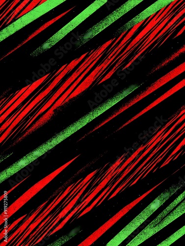 Abstract geometric pattern with diagonal red and green stripes on a black background.