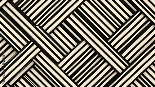 Abstract Geometric Pattern with Intersecting Black and White Striped Bands, Creating a Complex and Modern Design.