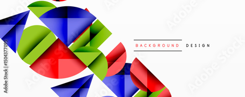 Abstract geometric shapes overlap, creating vibrant color composition. Modern design elements suggest dynamic visual experience.