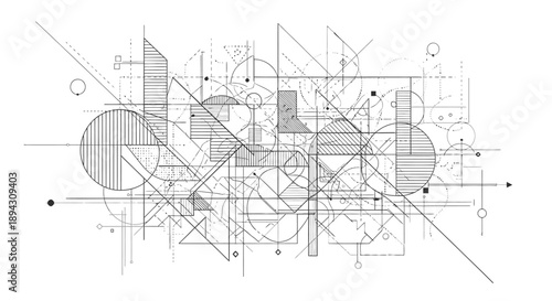 Abstract Geometric Technical Drawing with Intersecting Lines, Circles, and Triangles on White Background, Conceptual Design