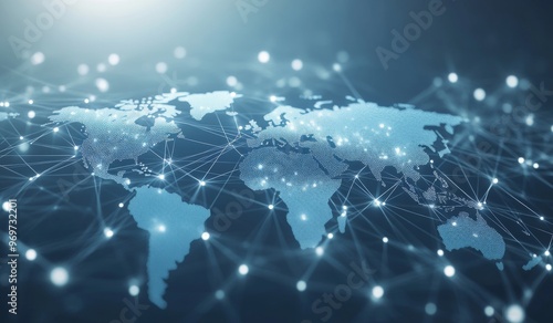 Abstract Global Network Concept Featuring a World Map with Digital Connections on a Blue Background. Light Gray Tones and White Line Art Illustration with Data Points and Technology Symbols.