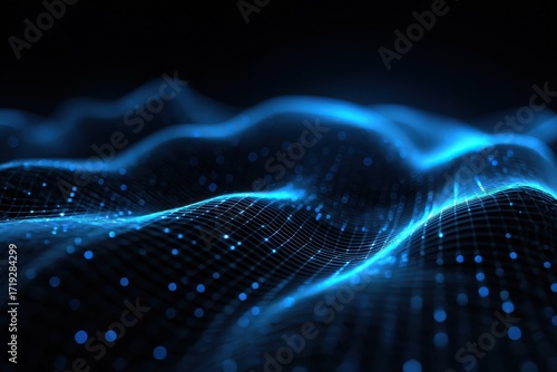 Abstract glowing blue digital wave pattern with interconnected nodes on a dark background