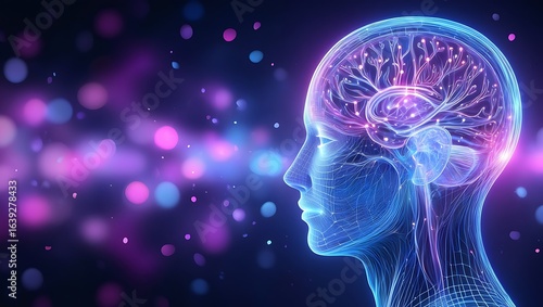 Abstract glowing neural network within a translucent human head profile