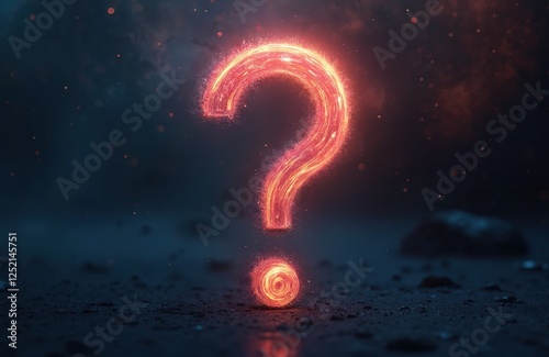 Abstract glowing question mark sign on dark background. Mystery concept image. Illustration of query mark, symbol of asking, knowledge exploration. Conceptual design of glow question mark sign.
