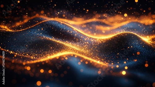 Abstract glowing wave of particles, dark background, blue and orange sparks.