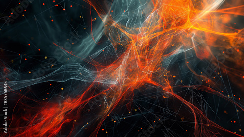 Abstract golden digital particle waves and dynamic light background with many glowing points and lines. Big data. Network of particles connected by lines, 3D rendering.