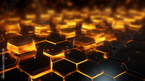 Abstract Golden Hexagonal Geometric Background. Shimmering golden hexagons creating a futuristic honeycomb pattern with a deep focus