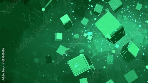 Abstract green background with scattered squares and dots.